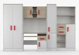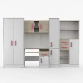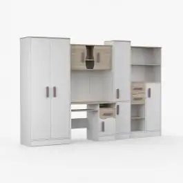 Aktion!Schrankwand mit Schreibtisch | Weiß / Eiche | Grammasos 01 | 196 x 300 x 52 cm | 8 Türen | 3 Schubladen | 19 Fächer | Kinderzimmer | Jugendzimmer