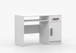 Aktion!Schreibtisch 1,1 Meter breit | 75 x 110 x 50 cm | Weiß | violette Holzgriffe | Smolikas 94 | 1 Türe | 1 Schublade | 3 Fächer