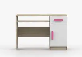 Aktion!Schreibtisch | 75 x 110 x 50 cm | 3 Fächer | 1 Schublade | Weiß / Sonoma Eiche | Smolikas 74 | 1 Türe | rosa Holzgriffe | eckig