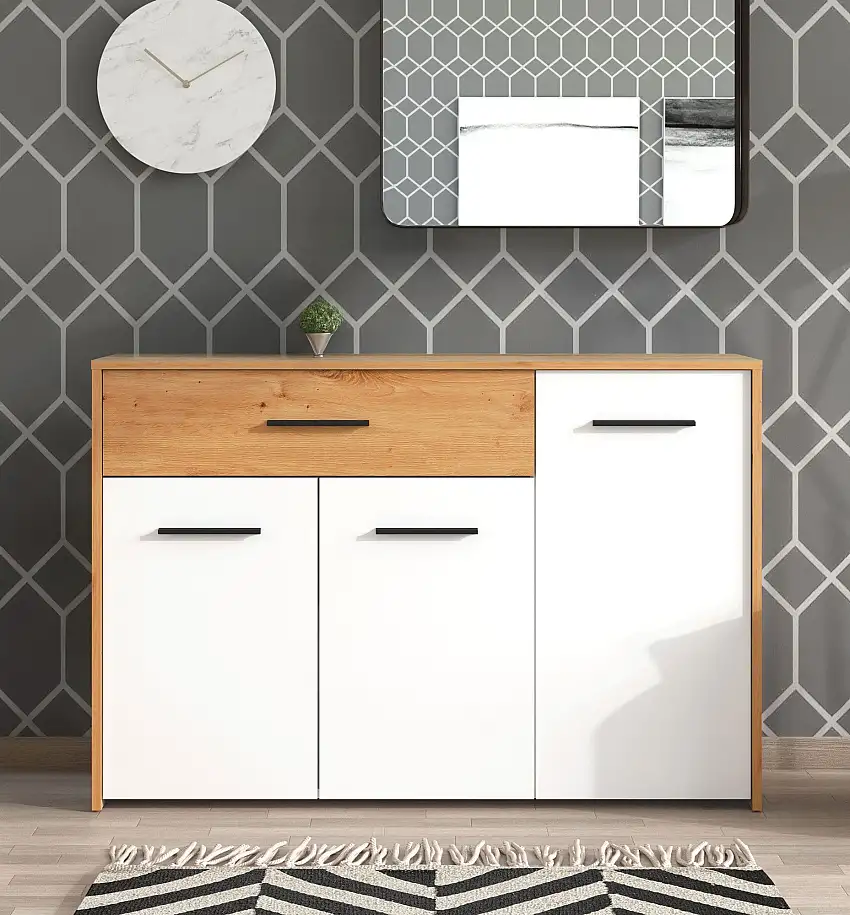Aktion!Sideboard / Kommode mit drei Türen Brus 04, Farbe: Eiche Artisan / Weiß, eine Schublade, vier Fächer, ABS-Kanten, Maße: 80,5 x 119 x 33 cm, für Wohnzimmer