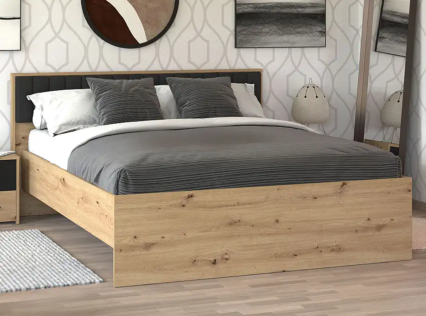 Aktion!Doppelbett mit gepolsterten Kopfteil Brus 20, Farbe: Eiche Artisan / Grau, stabil und langlebig, ABS-Kantenschutz, Liegefläche: 160 x 200 cm