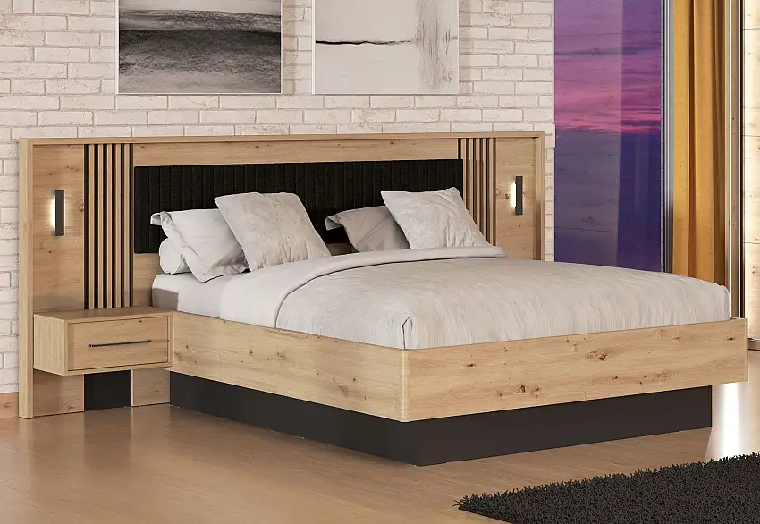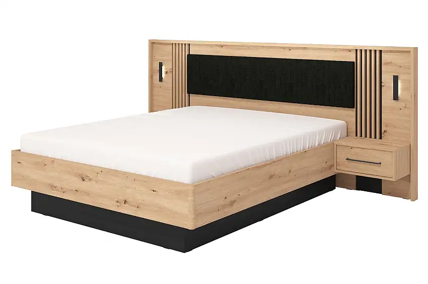 Aktion!Doppelbett inklusive zwei Nachtkommoden Indika 11, ABS-Kanten, Farbe: Eiche Artisan / Schwarz, Polsterung Dunkelgrau, Liegefläche: 160 x 200 cm