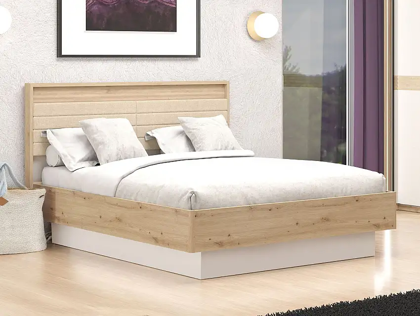 Aktion!Doppelbett Irigo 06, Farbe: Eiche Artisan / Kaschmir, gepolstertes Kopfteil: Beige, Liegefläche: 180 x 200 cm, ABS-Kantenschutz, Schlafzimmer