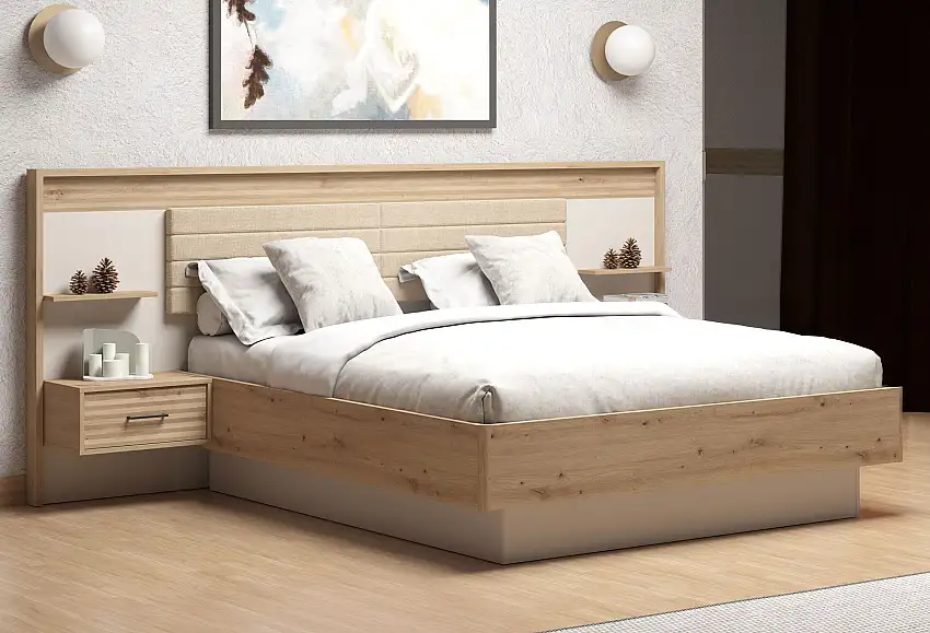 Aktion!Doppelbett inklusive zwei Nachtkommoden Irigo 03, ABS-Kanten, Farbe: Eiche Artisan / Kaschmir, Polsterung: Beige, Liegefläche: 160 x 200 cm