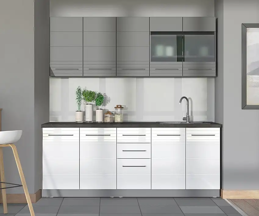 Aktion!Stylische Küchenzeile / Küchenblock mit zwei Schubladen Pluna 01, Farbe: Graphitgrau / Weiß Hochglanz, ein Hängeschrank mit Glastüren, 200 cm breit