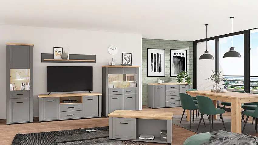 Aktion!Wohnzimmer – Set A Banat, 6-teilig, Farbe: Eiche Artisan / Graphitgrau / Grau, ABS-Kanten, zwei Vitrinen, eine Kommode, ein TV-Schrank, ein Wandregal und ein Couchtisch