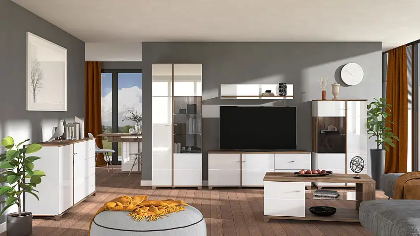Aktion!Wohnzimmer Komplett – Set B Kanjiza, 7-teilig, Farbe: Eiche Flagstaff / Weiß / Weiß Hochglanz, zwei Vitrinen, ein TV-Schrank, ein Wandregal, eine Kommode, ein Couchtisch und ein ausziehbarer Esstisch