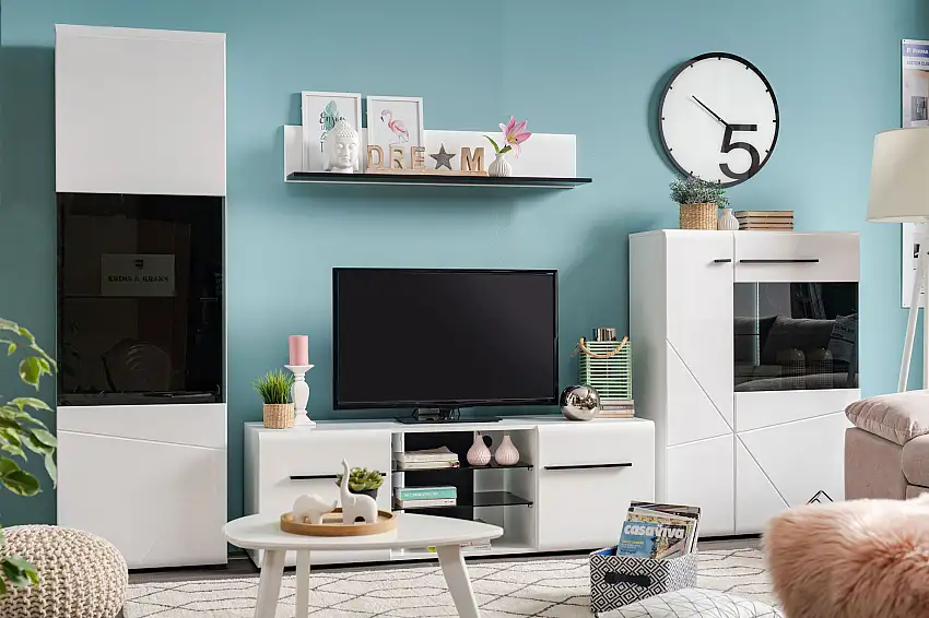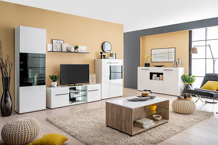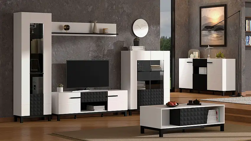 Aktion!Wohnzimmer Komplett – Set A Topola, 6-teilig, Farbe: Weiß / Schwarz / Schwarz Matt, neutrales Design, zwei Vitrinen, ein TV-Schrank, eine Kommode, ein Couchtisch, ein Wandregal