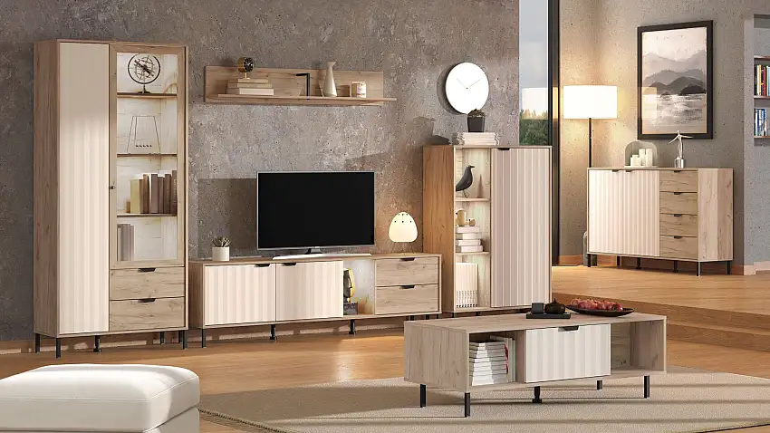 Aktion!Wohnzimmer Komplett – Set A Zitiste, 6-teilig, Farbe: Eiche Grau / Kaschmir, ABS-Kantenschutz, eine Vitrine, zwei Kommoden, ein Wandregal, ein TV-Schrank und ein Couchtisch