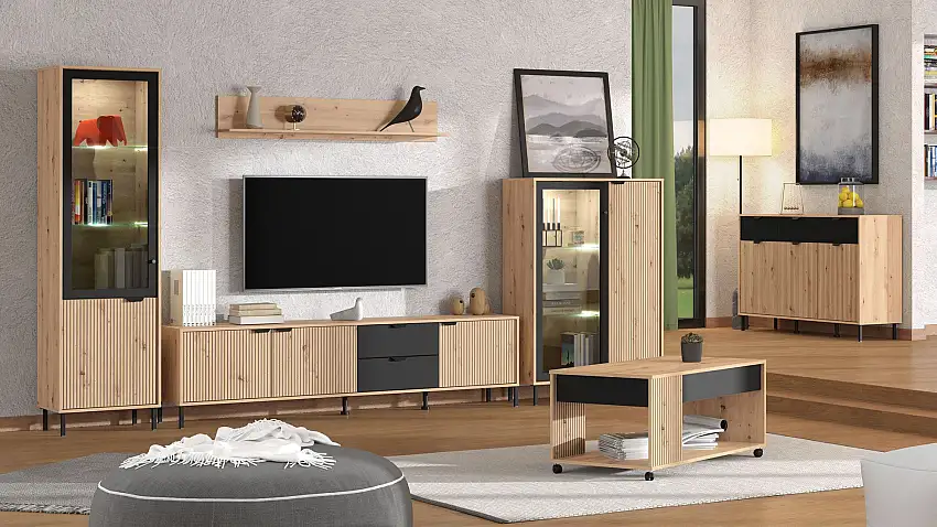 Aktion!Wohnzimmer Komplett – Set A Zvesdara, 6-teilig, Farbe: Eiche Artisan / Schwarz, zwei Vitrinen, ein TV-Schrank, ein Wandregal, eine Kommode, ein Couchtisch, ABS-Kanten