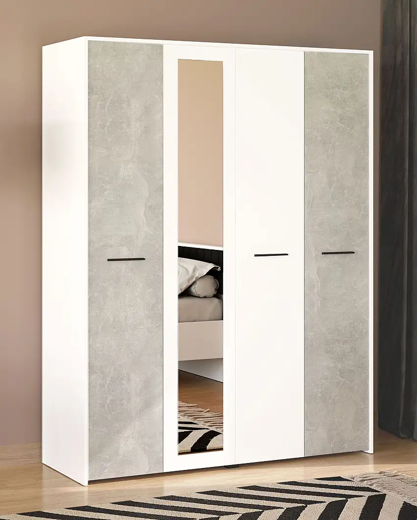 Aktion!Drehtürenschrank in Beton Optik Brus 09, Farbe: Weiß / Beton, Griffe: Schwarz, Spiegel, eine Kleiderstange, sechs Fächer, Maße: 203,5 x 157,5 x 53 cm