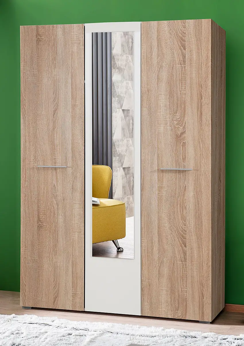 Aktion!Dreitüriger Kleiderschrank / Drehtürenschrank mit einer Spiegeltür Vibas 02, Farbe: Eiche Sonoma / Weiß, eine Kleiderstange, Maße: 200 x 114,5 x 51,5 cm