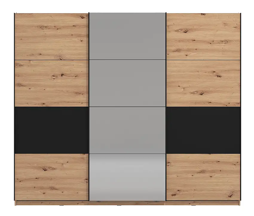 Aktion!Dreitüriger Schwebetürenschrank Crina 10, Farbe: Eiche Artisan / Schwarz, Spiegel, zwei Kleiderstangen, ABS-Kanten, Maße: 224 x 262,5 x 65,5 cm