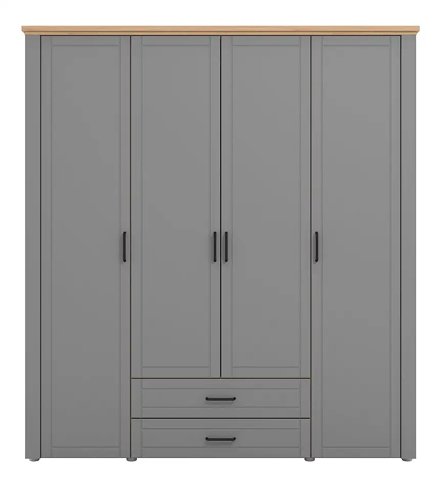 Aktion!Drehtürenschrank mit zwei Schubladen Banat 13, Farbe: Graphitgrau / Eiche Artisan, vier Türen, eine Kleiderstange, Maße: 210 x 190 x 58 cm, 10 Fächer