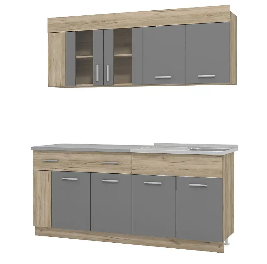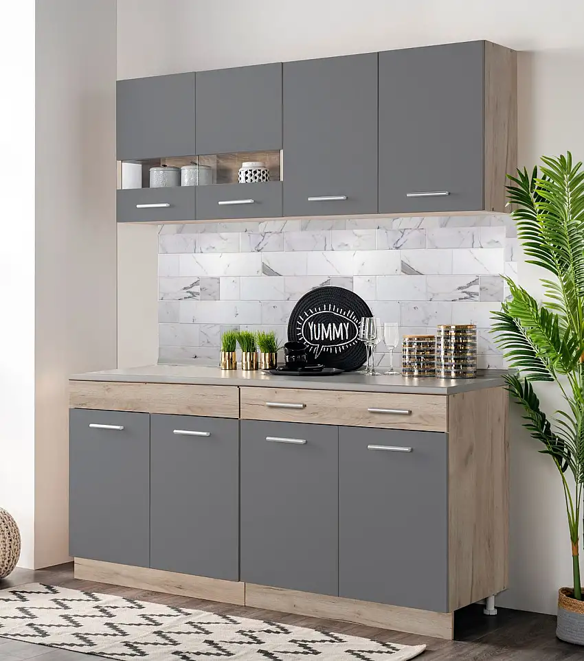 Aktion!Dunkle Küchenzeile / Küchenblock Pici 02, Farbe: Eiche Grau / Graphit, ABS-Kantenschutz, zwei Hängeschränke mit Glastüren, 180 cm breit