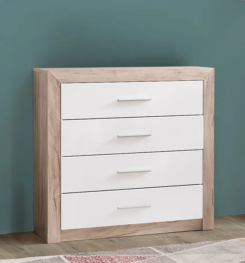 Aktion!Einfache Kommode mit vier Schubladen Pasua 01, Farbe: Eiche Grau / Weiß, ABS-Kanten, Griffe: Silber, Maße: 90,5 x 93 x 35 cm, für Wohnzimmer