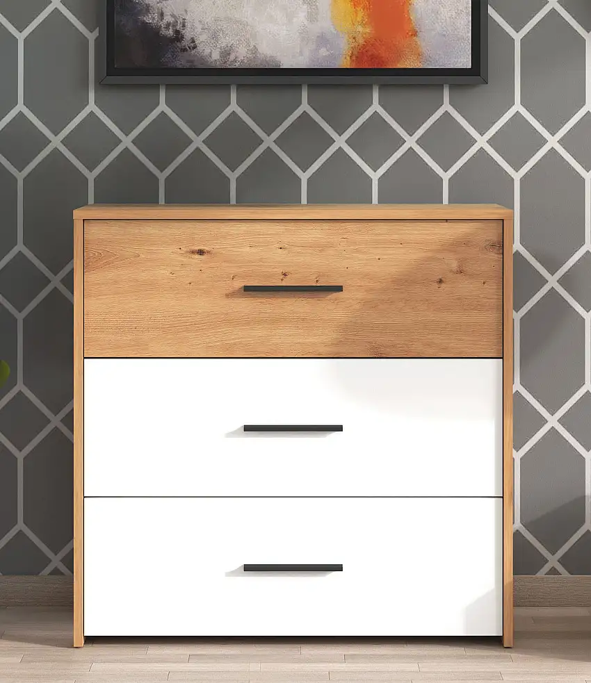 Aktion!Einfache Kommode mit drei Schubladen Brus 05, Farbe: Eiche Artisan / Weiß, Griffe: Schwarz, Maße: 80,5 x 80,5 x 33 cm, einfaches und modernes Design