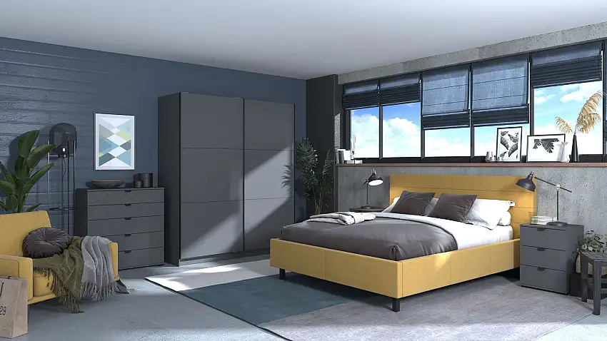 Aktion!Dunkles Schlafzimmer – Set A Kule, 4-teilig, Farbe: Graphitgrau, ABS-Kantenschutz, ein Kleiderschrank, eine Kommode und zwei Nachtkommoden, modernes Design
