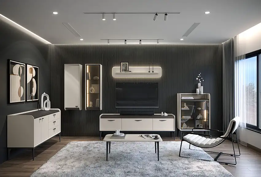 Wohnzimmer Komplett – Set A Manono | 7-teilig | Farbe: Creme | LED-Beleuchtung | Soft Close System | Metallbeine