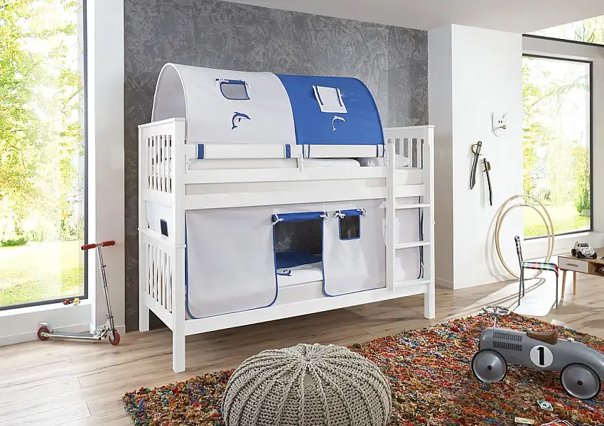 Tolles Etagenbett mit 2 Schlafgelegenheiten. Besondere Funktionalität bieten die beiden Bücherregale an der Rückseite des Bettes. Sie bieten viel Platz und Ablagemöglichkeiten für Bücher oder andere dekorative Gegenstände. Das Bett ist aus massiver Buche in Ausführung weiß lackiert. Die Liegefläche ist jeweils 90 x 200 cm und die Leiter sowie 2 Rolllattenroste sind im Lieferumfang enthalten. Die obere Liegefläche hat einen umlaufenden Absturzschutz. Die Leiter ist wahlweise links oder rechts montierbar. Breite Trittstufen sorgen für sicheres Hinauf- und Hinabsteigen. Die Bettpfosten sind massive Holzwinkel, die dem Bett eine hervorragende Standfestigkeit bieten. Das Bett ist hochwertig verarbeitet und zeichnet sich durch sehr gute Stabilität aus. Die Matratze, die Kissen und Dekomaterial gehören nicht zum Lieferumfang. Benötigte Stellfläche ca: B: 208 H: 140/170 T: 140 cm. Die Ware ist zerlegt, zur einfachen Selbstmontage.