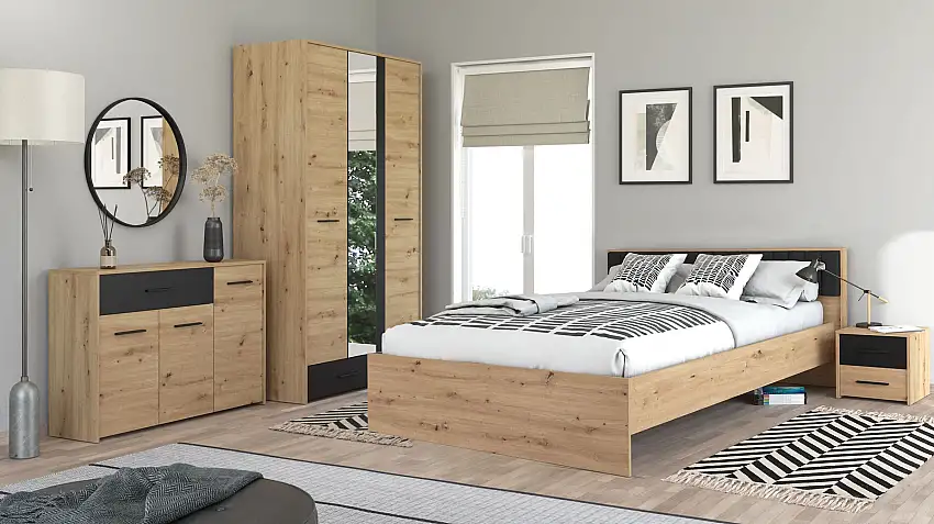 Schlafzimmer – Set A Fafe | 6-teilig | Farbe: Eiche Artisan / Schwarz | Soft-Close-Funktion | Kleiderschrank | viel Stauraum | 6 Schubladen