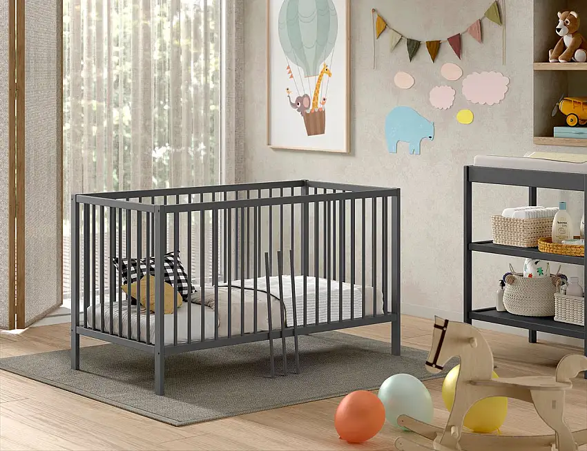 Das Baby Zimmer Set DINO best. aus dem Baby-/Juniorbett und dem Wickelregal. Einen doppelten Vorteil haben Sie, da das Gitter Babybett zum Junior-Bett umgebaut werden kann. Eine überaus zweckmäßige Möglichkeit, das Babybett weiter als Junior-Bett zu nutzen. Das Material ist Buche massiv, weiß lackiert. Die Liegefläche ist 70 x 140 cm, inklusive eines 3-fach höhenverstellbaren Lattenrostes, mit 15 Leisten. Der Verstellbarkeitsbereich des Lattenrostes ist vom Boden bis Oberkante Lattenrost ca. 18,3 cm, 33,9 cm und 49,5 cm. Das erleichtert das hereingreifen und ermöglicht Ihnen, Ihr Kind einfach zu erreichen. Die Gitterstäbe haben einen Durchmesser von 1,6 cm und es gibt 3 Schlupfsprossen. Die massiven Bettpfosten haben ein Stärke von ca. B: 45 x T: 22 mm. Das Kopf-, Fußteil und Seitengitter sind ca. 84,4 cm hoch. Das Bett ist unten offen mit einer Bodenfreiheit von ca. 18,3 cm. Zusätzlich zum Lieferumfang gehört die Bettseite für den Umbau zum Junior Bett. Die Voraussetzung für den Umbau sollte sein, dass Ihr Kind aus dem Kinderbett heraus gewachsen ist und es bereits selbständig ins Bett hinein und heraus steigen kann. Die Einstiegshöhe ist vom Boden bis Oberkante der Bettseite dann 31,8 cm. Somit haben Sie und Ihr Kind länger Freude an dem Bett. Der Artikel ist stabil und hochwertig verarbeitet, nach EN716-1 u. -2. Stellfläche Baby-/Juniorbett ca.: B: 144,4 x H: 84,4 x T: 75,5 cm. Ebenso zum Lieferumfang gehört das Beistellregal, das auch als Wickeltisch genutzt werden. Praktisch sind die drei Ablage-Ebenen, bei denen man die Dinge des täglichen Bedarfs schnell zur Hand hat. Die obere Ebene hat eine Umrandung, in die eine Wickelauflage hineingelegt werden kann und auch halt findet. Das Innenmaß ist ca. B: 75 x H: 5,2 x T: 45 cm. Die stabile Bauweise aus hochwertigem Buchen-Holz gibt dem Artikel eine sehr gute Standfestigkeit. Das Gestell hat eine Pfostenstärke von ca. 35 x 22 mm. Der mittlere und untere Boden haben eine Größe von ca. B: 75 x T: 45 cm und bieten viel Platz für Babyutensilien oder Handtücher. Die Bodenfreiheit von 18 cm ermöglicht problemloses reinigen unter dem Regal. Max. Belastung Babybett ca. 20 kg, max. Belastung Regal ca. 11 kg. Die Beschläge sind aus Metall und die Matratze und Deko gehören nicht zum Lieferumfang. Die Ware ist zerlegt, mit Montageanleitung zur einfachen Selbstmontage. Stellfläche Regal ca.: B: 79,4 x H: 95 x T: 49,8 cm.