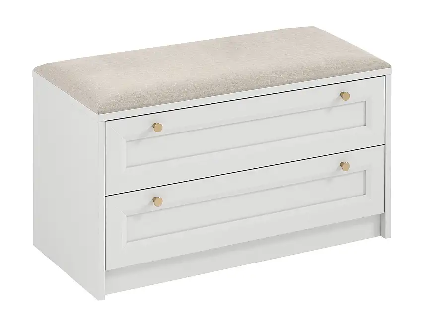 Die edlen weißen Möbel der Serie Ersigen erzeugen ein ruhiges und angenehmes Raumklima. Die eleganten Fronten mit attraktiven Details sowie die Metallgriffe in Gold verleihen dieser Serie einen besonderen Charakter.