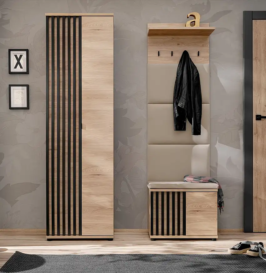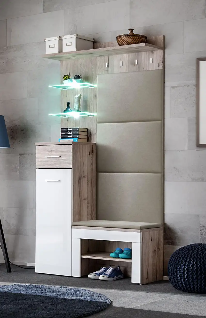 Durch ihre fünf Türen, bestehend aus Drehtüren und einem Kippfach, eignet sich die Wohnwand nicht nur als Stauraum, sondern auch als elegantes Möbelstück, das Ihre vier Wände vervollständigt. Der moderne Stil passt in jede Einrichtung und schafft eine gemütliche Atmosphäre.